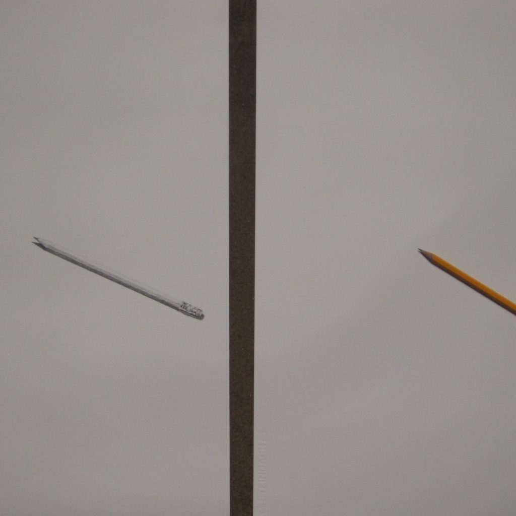 A studio in a studio. During an open studio weekend, this studio is to be viewed through a small window. All kinds of tools and props are there: a saw sawing in itself, a drawing from a pencil as a sketch for a painting about paint, a pen filled pencil and a chisseled chissel for example.